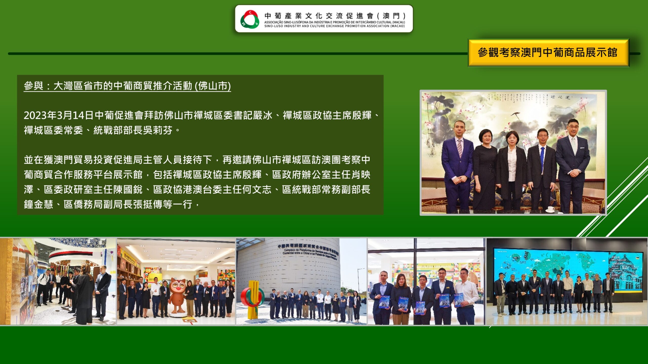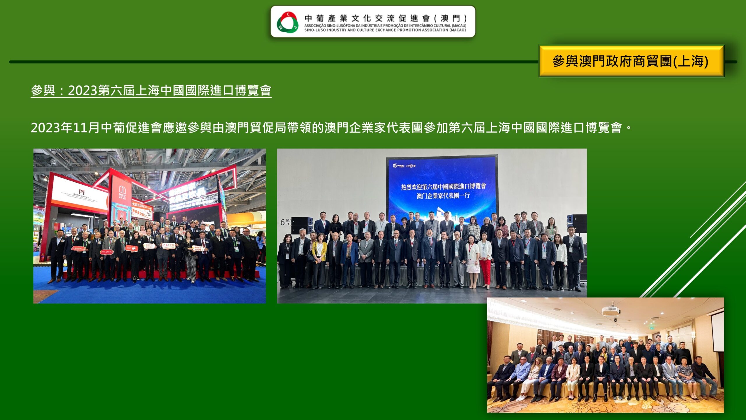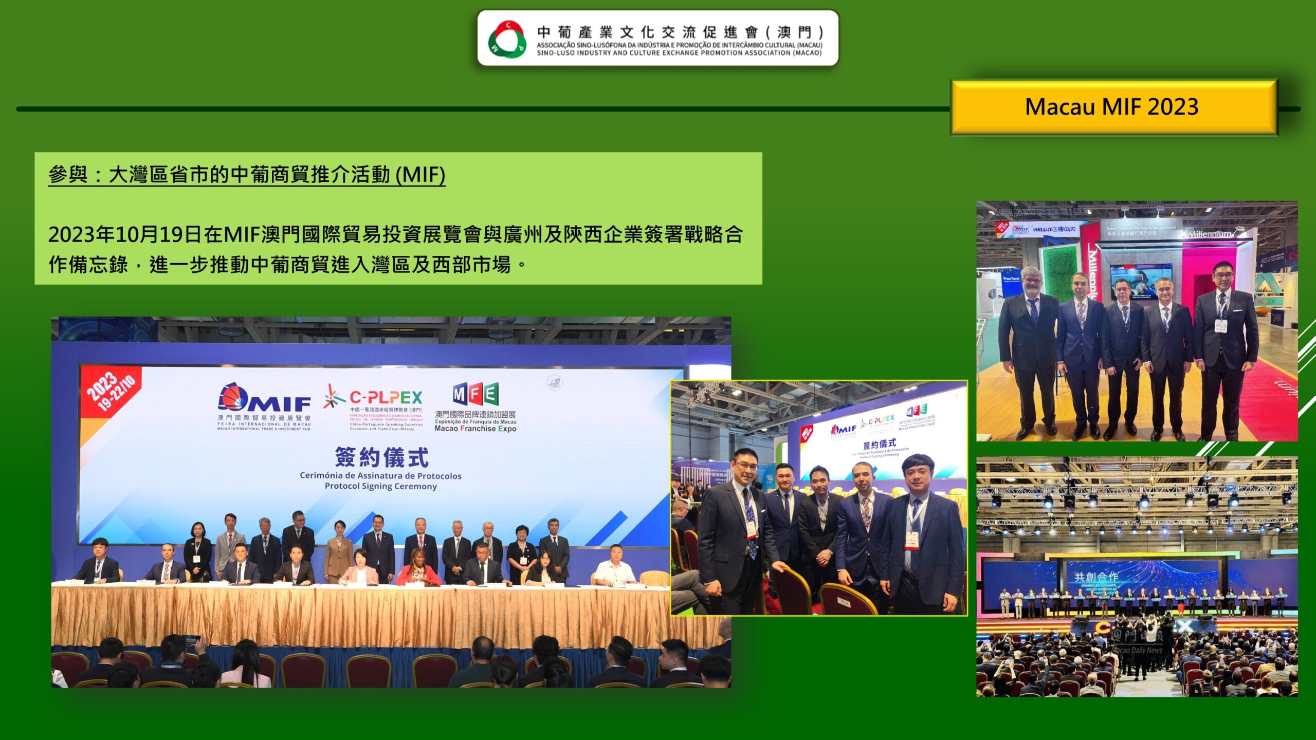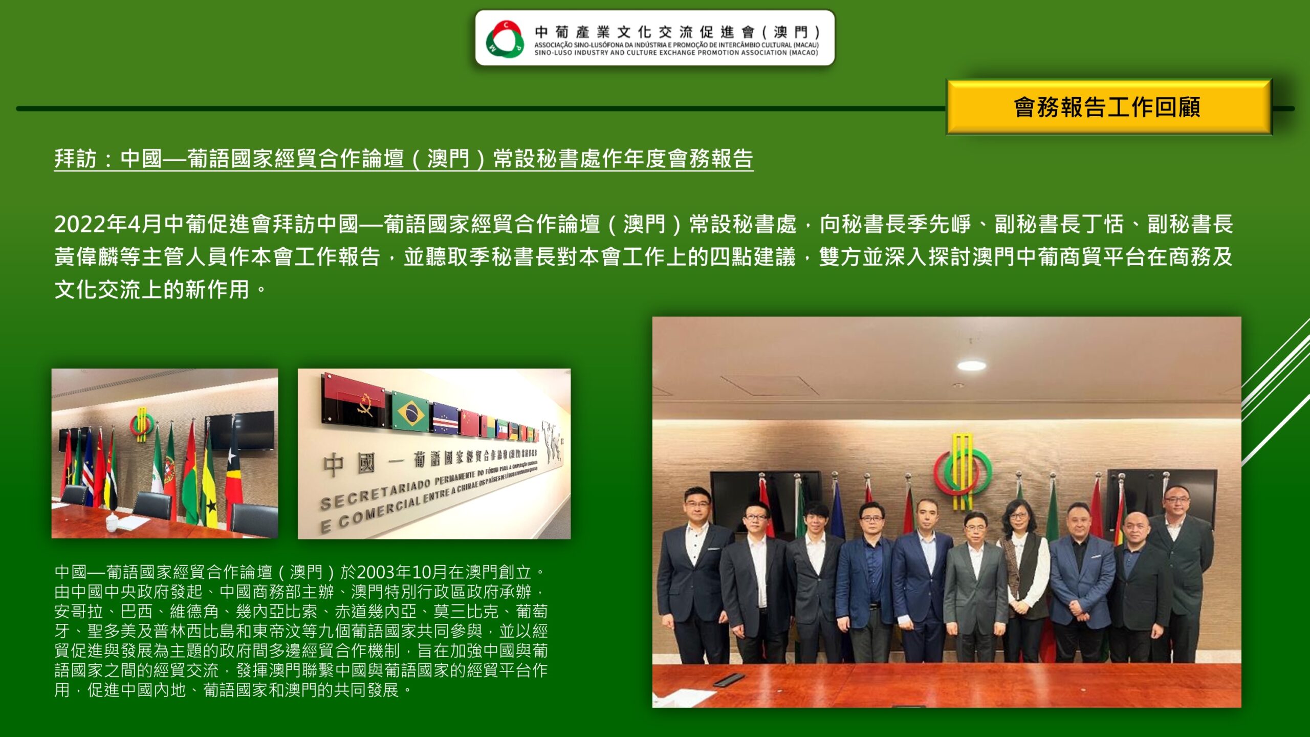 「 中葡產業文化交流促進會(澳門) Associação Sino-Lusófona da Indústria e Promoção de Intercâmbio Cultural (Macau) 」是經澳門特區政府批准、澳門註冊成立的非謀利社會團體,是為了響應國家的《粵港澳大灣區發展規劃綱要》賦予澳門“一中心、一平台、一基地”發展定位,為澳門融入國家發展大局,促進澳門產業多元化,搭建中葡產業,文化領域交流、互動的專業性平台。